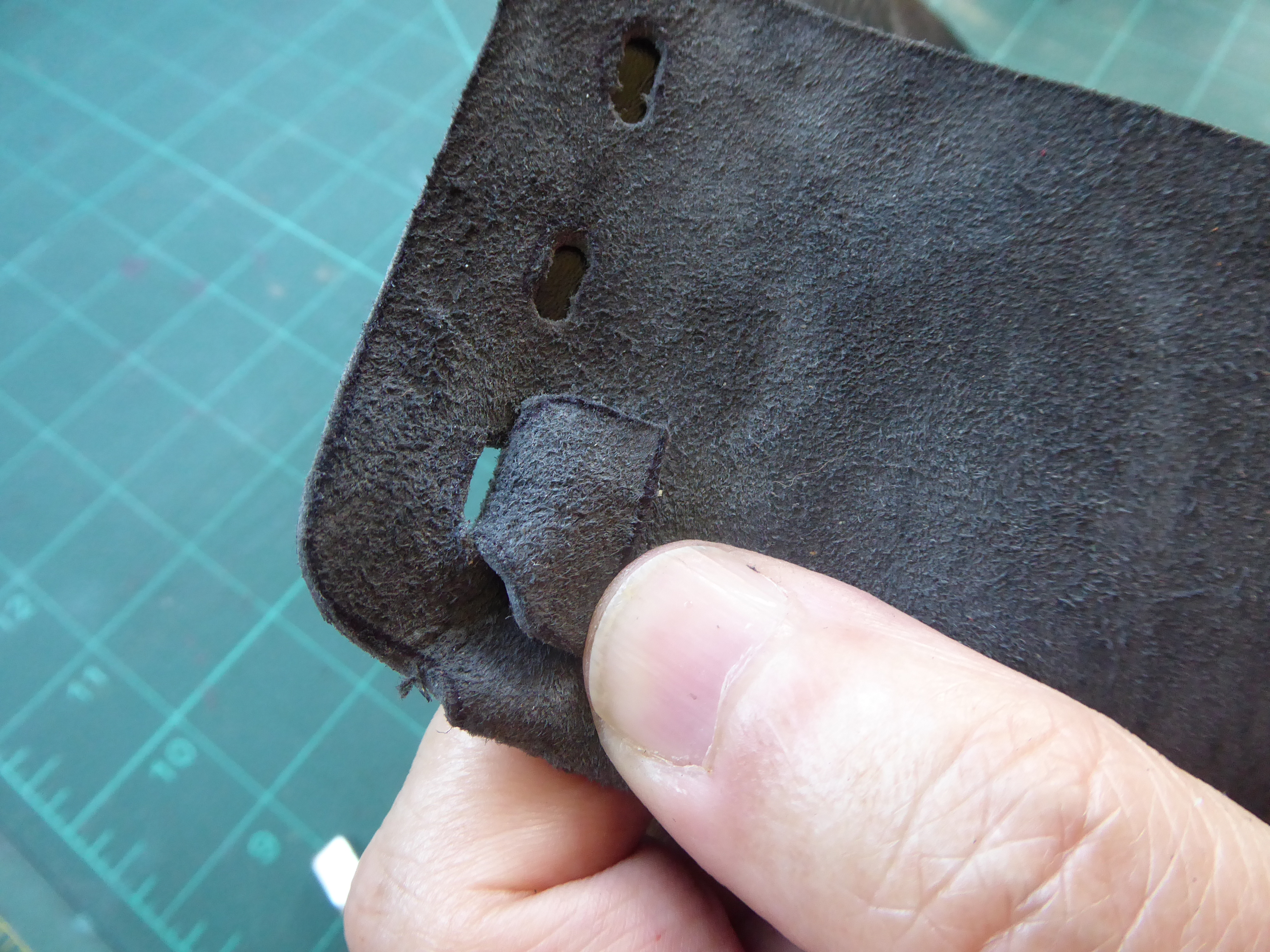 With the leather cut to shape and all the slots cut out it should look like this.